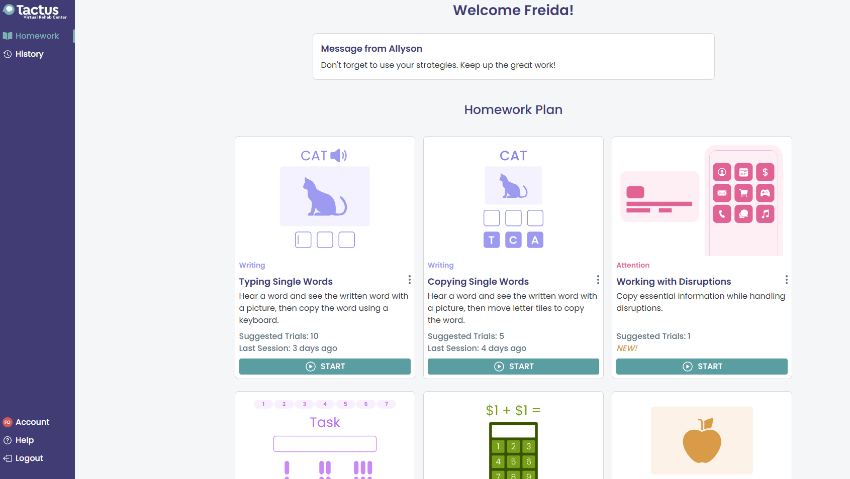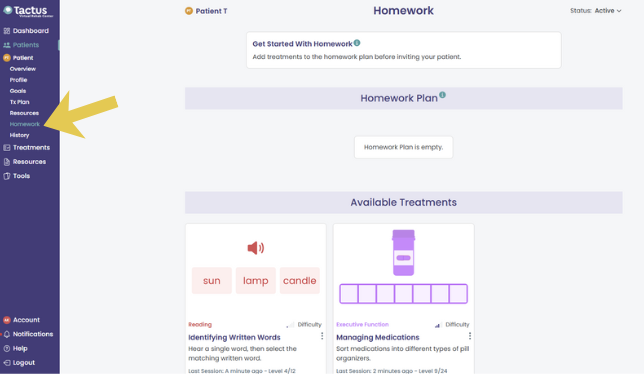 For homework, your patients see a similar interface to yours, but simplified. They will see only the treatments you've assigned on the front page under the message from you. They can access their History, Help, and Account from the side menu.