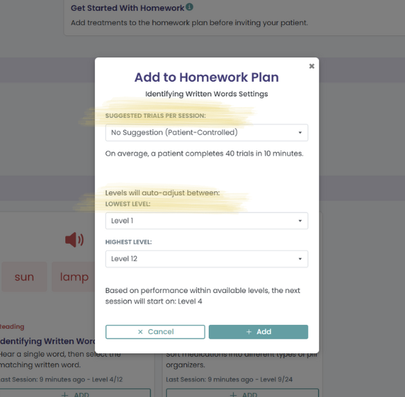 - Click +Add to add a treatment to the homework. Then you'll have the option to customize trials and levels or click + Add again to use default settings.