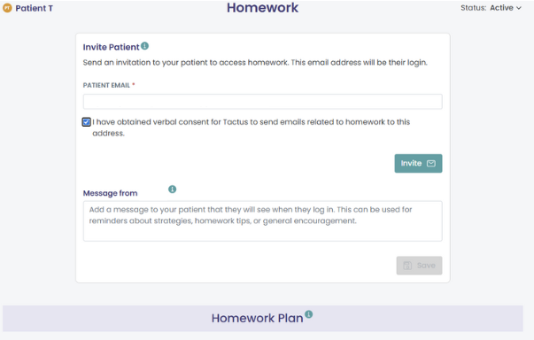 - Add the patient's email address after getting verbal consent. Add an optional Message and click Save. Click Invite.