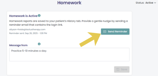 If you'd like to send a gentle nudge to reminder your patient to do homework with the link to log in, you can do so at any time. Click Send Reminder.