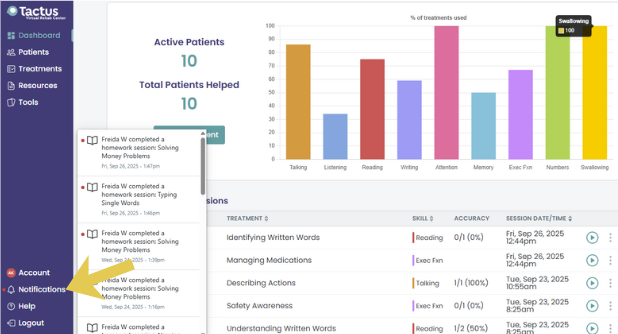 You can see when your patients did their homework, along with a report of how they did! When your patient completes homework, you'll see a red dot next to Notifications under your account name in the bottom left-hand part of the screen.