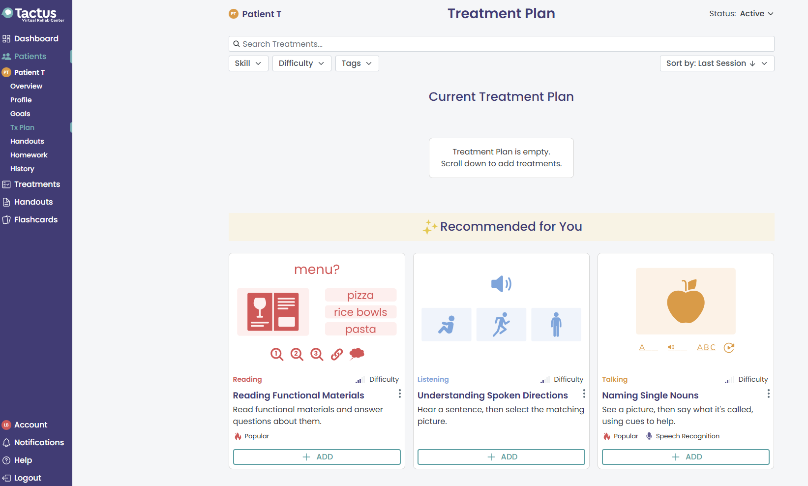 - Navigate to the Tx Plan tab under the patient to create a Treatment Plan. See recommended treatments based on speech diagnosis and quickly find relevant treatments using the Skills, Difficulty, and Tags filters. Use the + Add button to add a treatment to the patient's plan. Click Start to try out a treatment.