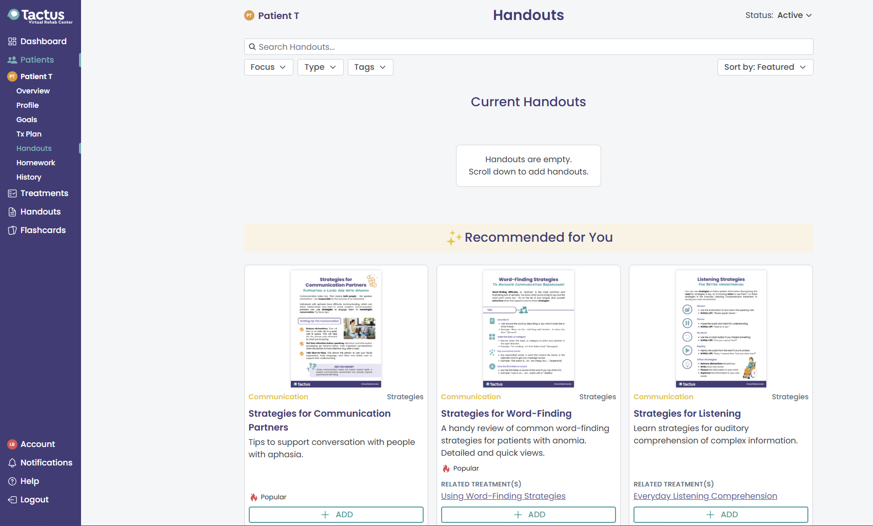 - Click on Handouts on the left-side menu to view various handouts for patient and clinical education. Filter handouts by Focus, Type, or Tags. Click + Add to add it to your patient's profile. You can also click to download a handout to send to your patient or click view to review in session.