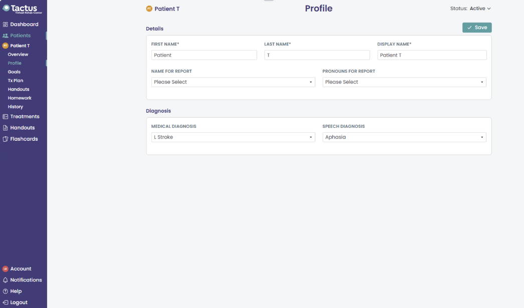- After inputting a first and last name, press + Create. This will bring you to the Patient Profile. It's important to fill in each section to generate personalized reports and recommendations.
