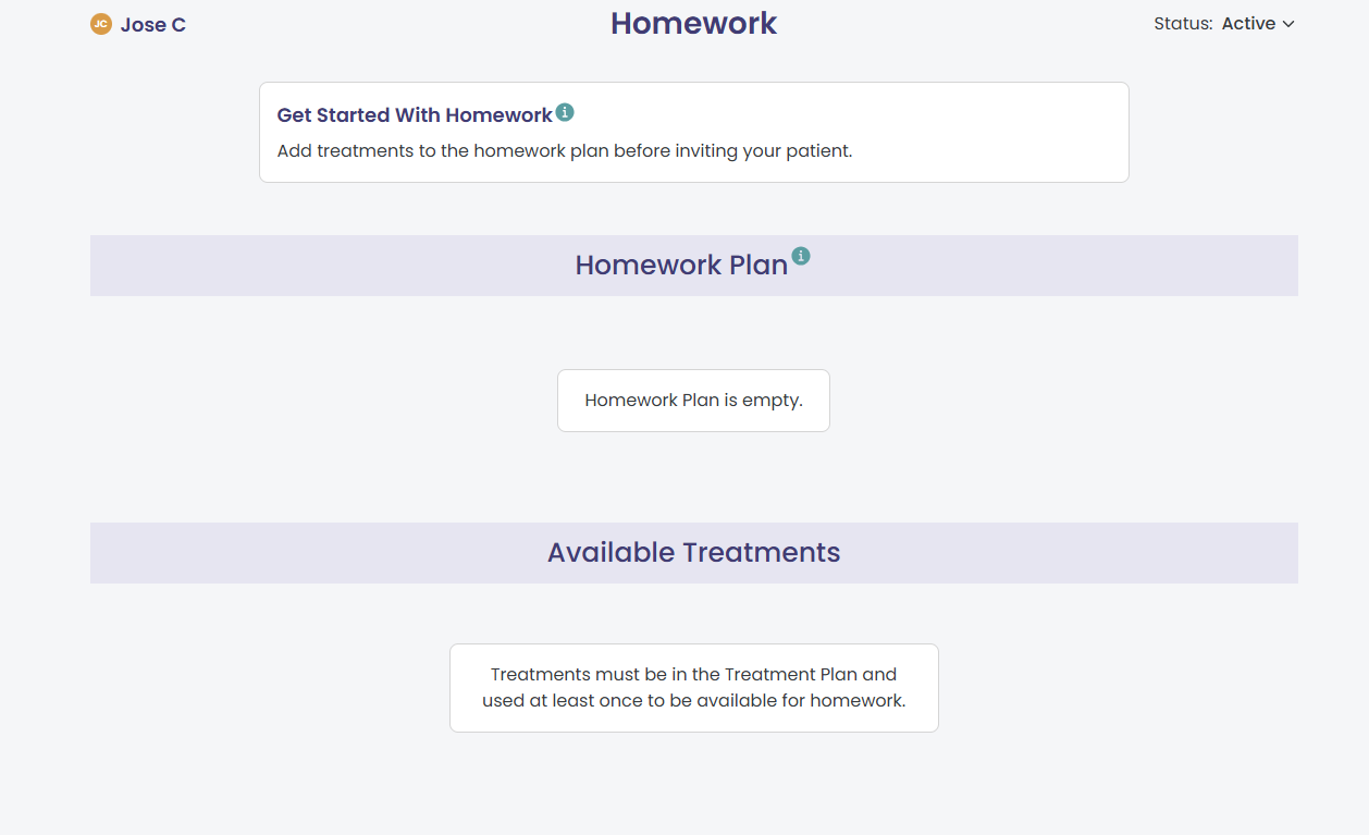 Note: If there are no available treatments, it's because you must a add a treatment to the patient's plan and use it at least once, for it to appear under "Available Treatments" to assign for homework.