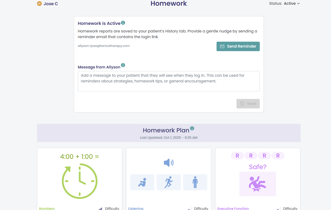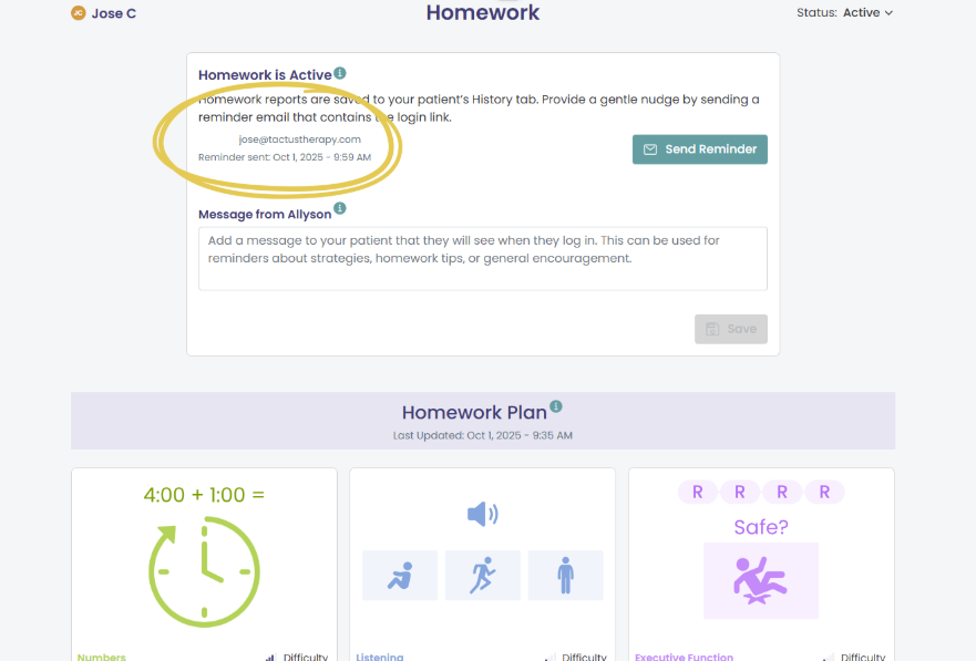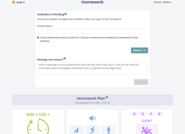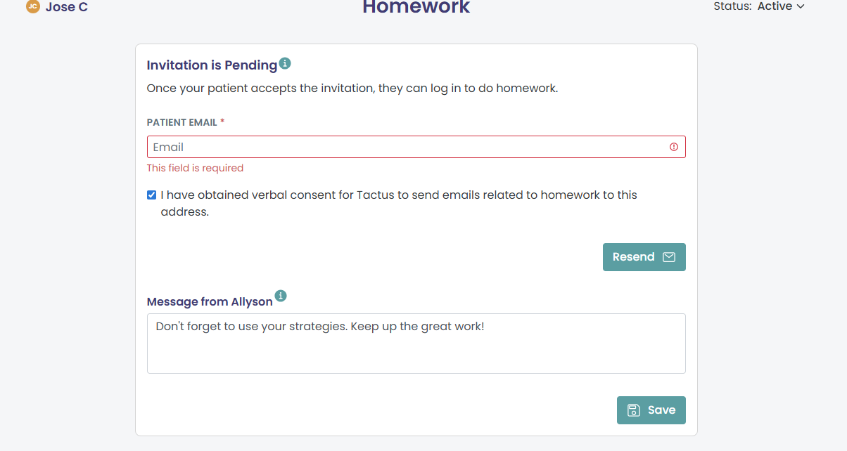 Once your patient has accepted the invitation and set up their account, the Resend option will no longer be available. Instead, you will see Homework is Active at the top of your screen in your patient’s profile under the Homework section. See screenshot below.