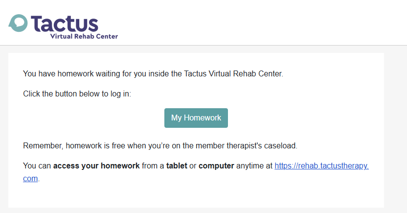 Click the Send Reminder button (see button above). This will send them an email with a link prompting them to view their homework. See the email your patient receives below.